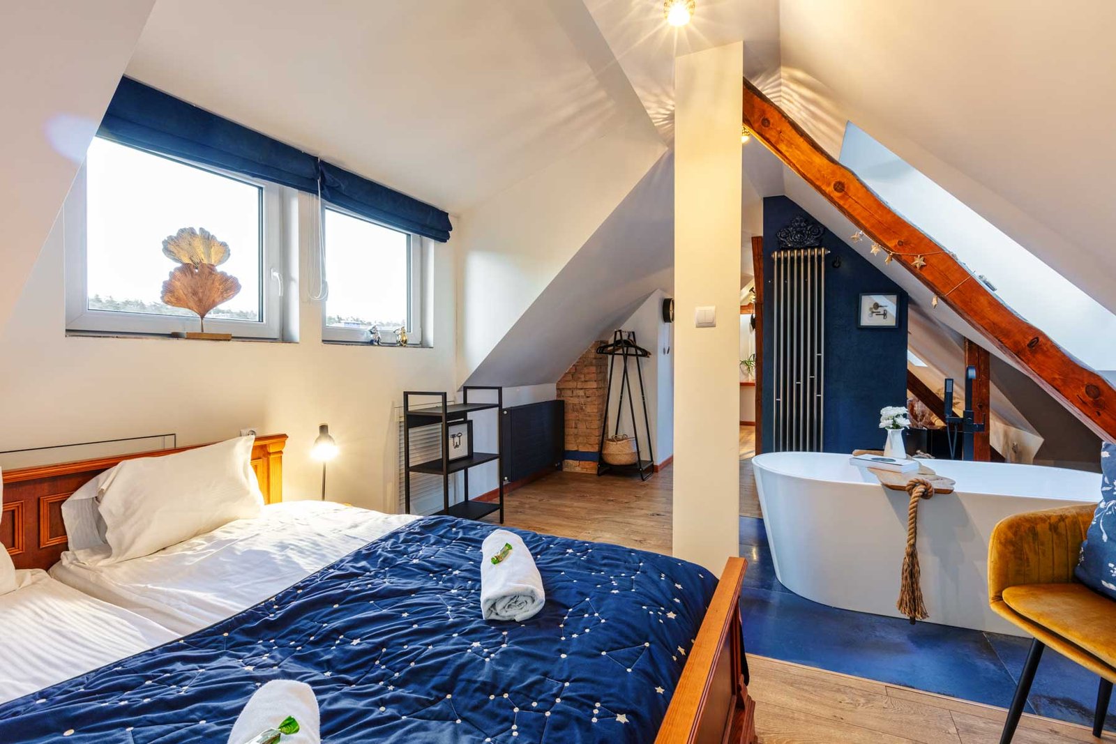 If you dream of a romantic evening and a peaceful moment while gazing at the night sky, the “Under the Stars” Apartment is the perfect choice. This exclusive space is located on the top floor of the building, where the historic character of the architecture blends harmoniously with an elegant, modern interior design.